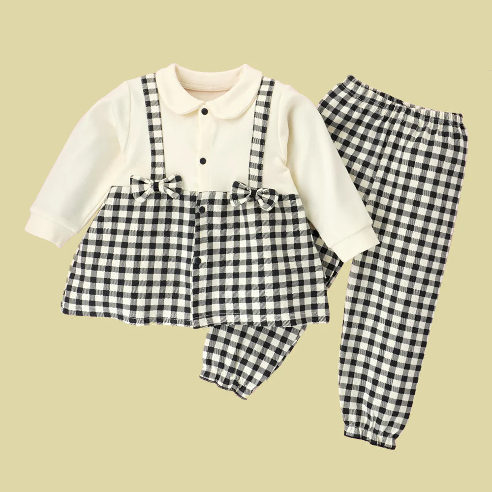 1. Adorable Gingham Design: Add a touch of vintage charm to your toddler’s wardrobe with this adorable 2-piece gingham outfit. The cream long-sleeve top features a classic collar and cute suspender-style gingham overlay, perfectly paired with matching gingham pants for a coordinated and stylish look. The pants has soft elastic at the bottom to give a cute and yet comfortable fit on the child.