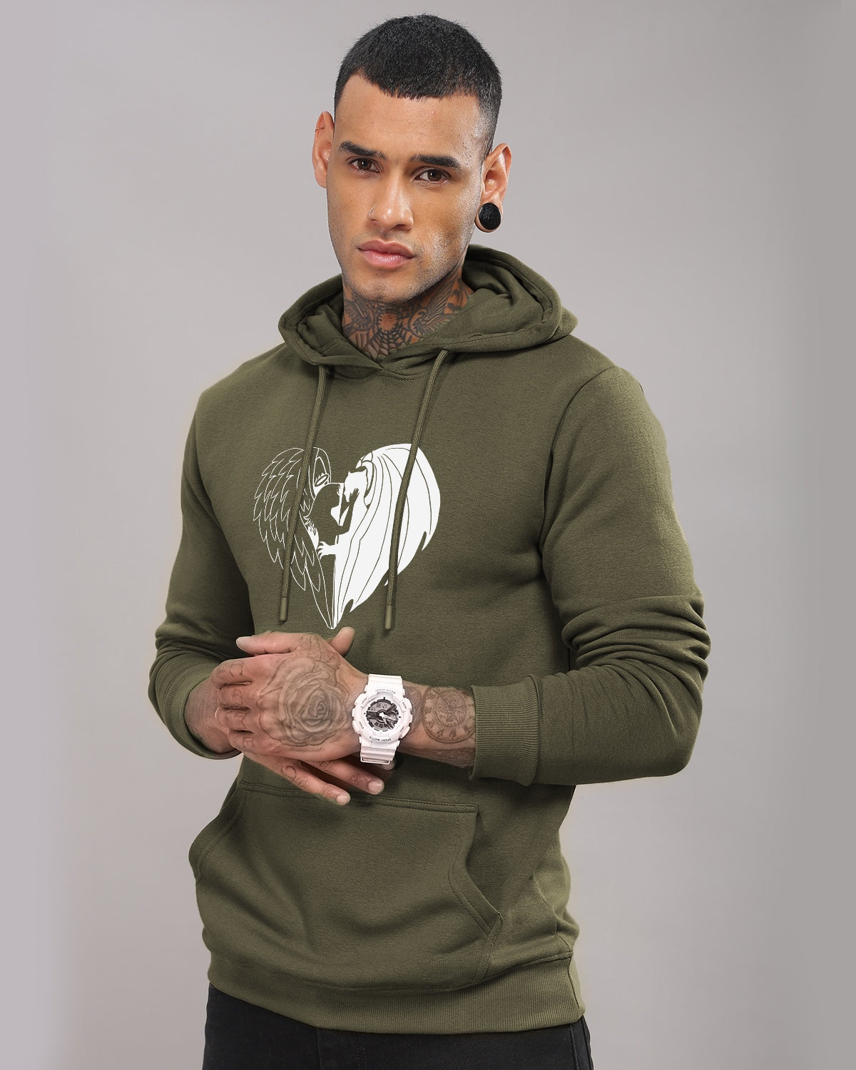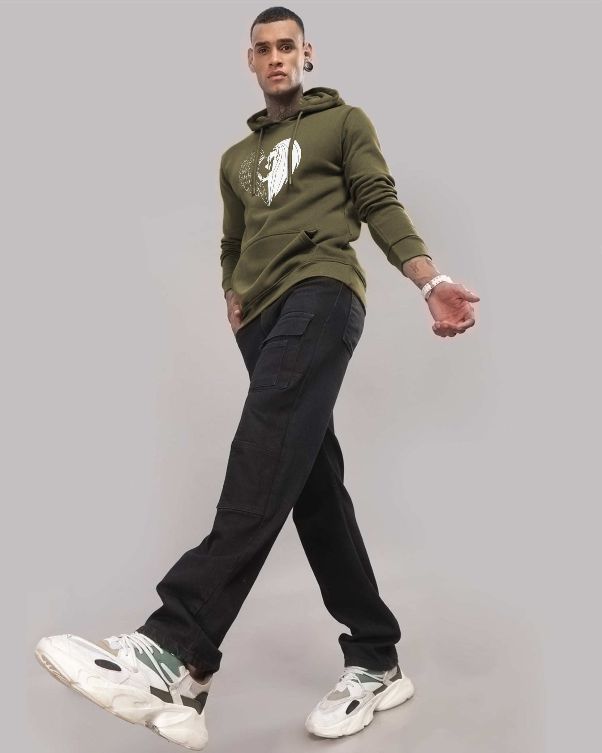 The Adro 100% Cotton Printed Hoodie for Men is a perfect blend of comfort, style, and durability. This hoodie is designed to meet the needs of the modern man, offering both functionality and a fashionable look that is ideal for casual wear. Material: Made from 100% high-quality cotton, this hoodie ensures a soft and breathable feel against the skin, making it perfect for year-round wear. Print: The hoodie features vibrant, high-definition prints that are long-lasting and resistant to fading, thanks to advanced printing technology. Fit: The hoodie offers a regular fit that provides ample room for movement while maintaining a structured look. It is designed to complement various body types. Hood: Equipped with an adjustable drawstring hood that provides additional warmth and a customizable fit, ensuring comfort in cooler weather. Pockets: Includes a spacious kangaroo pocket in the front, offering practical storage space for your essentials and a cozy place to warm your hands. Cuffs & Hem: Ribbed cuffs and hem provide a snug fit, helping to retain body heat and keep the hoodie in place during activities. Colors & Prints: Available in a range of colors and unique printed designs, from minimalist patterns to bold graphic prints, allowing you to express your personal style. Versatility: This hoodie pairs effortlessly with jeans, joggers, or shorts, making it a versatile addition to your wardrobe for both lounging and casual outings.
