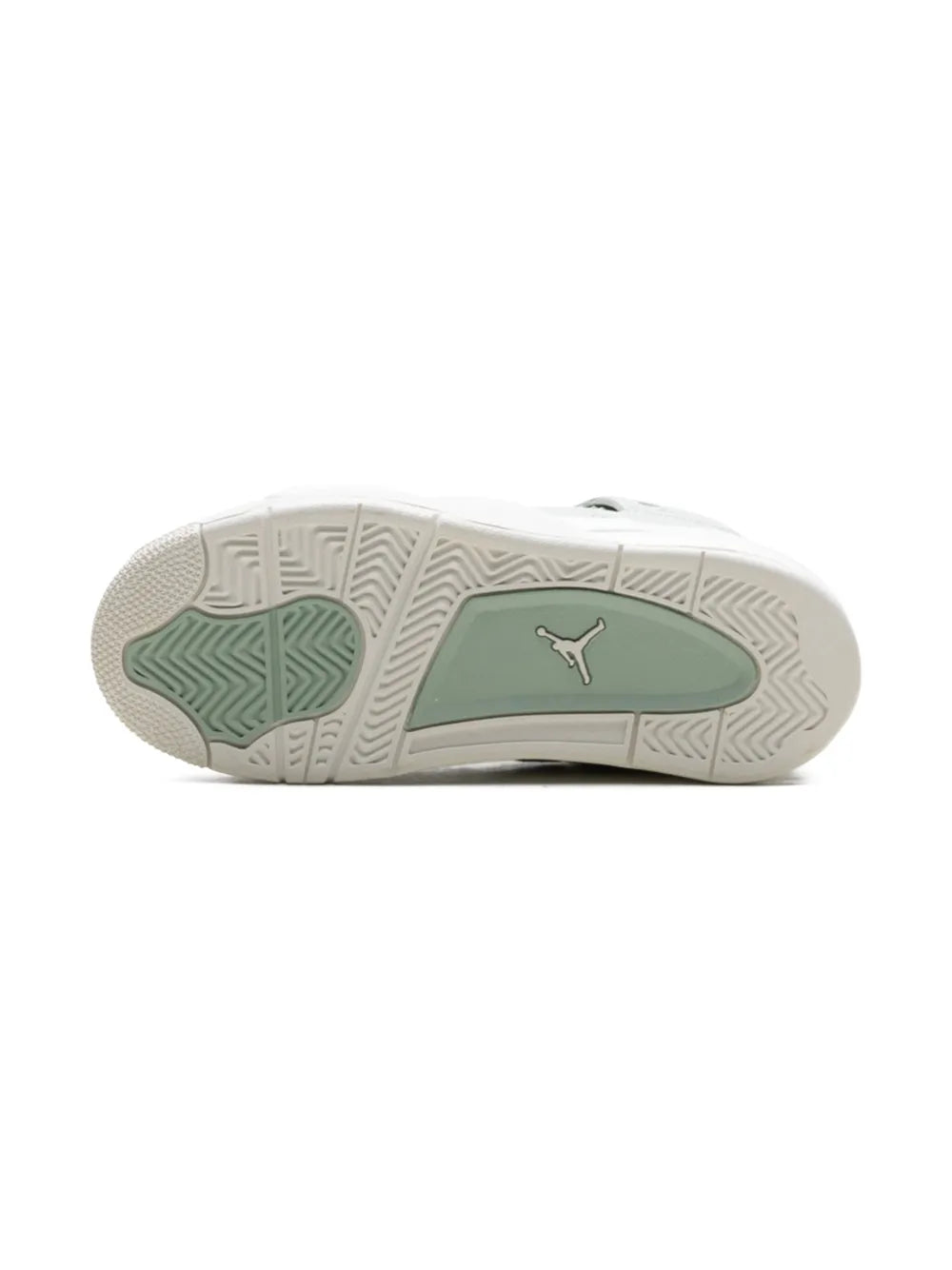 The Women's Air Jordan 4 Retro 'Abundance / Seafoam' showcases a pale green hue on the upper, crafted from smooth leather with breathable quarter panel netting. Tonal Jumpman branding adorns the woven tongue tag and heel tab. The monochrome design is interrupted by molded eyelets in a gleaming metallic silver finish. Anchoring the sneaker is an off-white polyurethane midsole, featuring a visible Air-sole unit nestled in the heel.