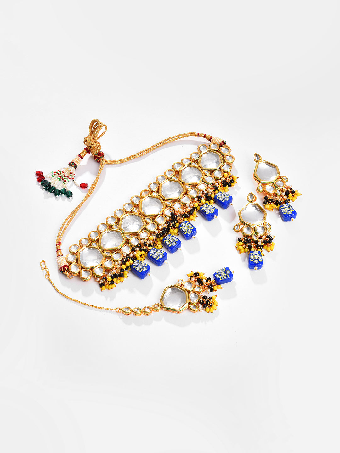 Gold Plated Kundan Beaded Necklace, Earrings and Maang Tikka Set