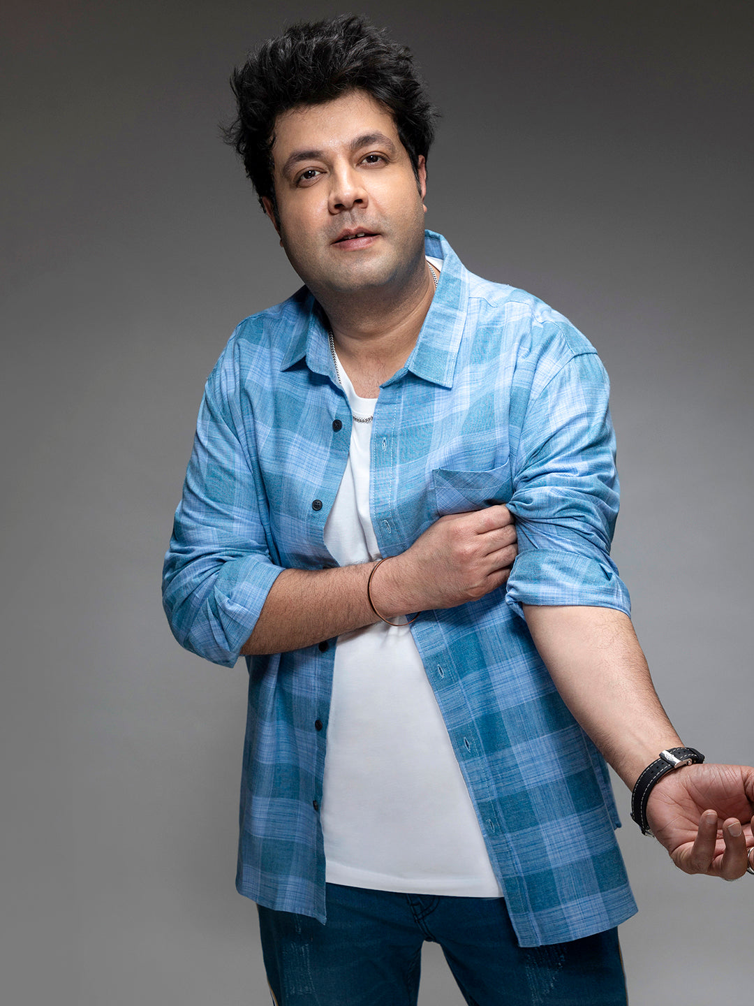 The best accessories to wear with a cotton blue checked shirt for plus size men are a cap, watches, a cross-body body, a messenger bag or crossbody bag, a belt, and a jacket or blazer as a layer.