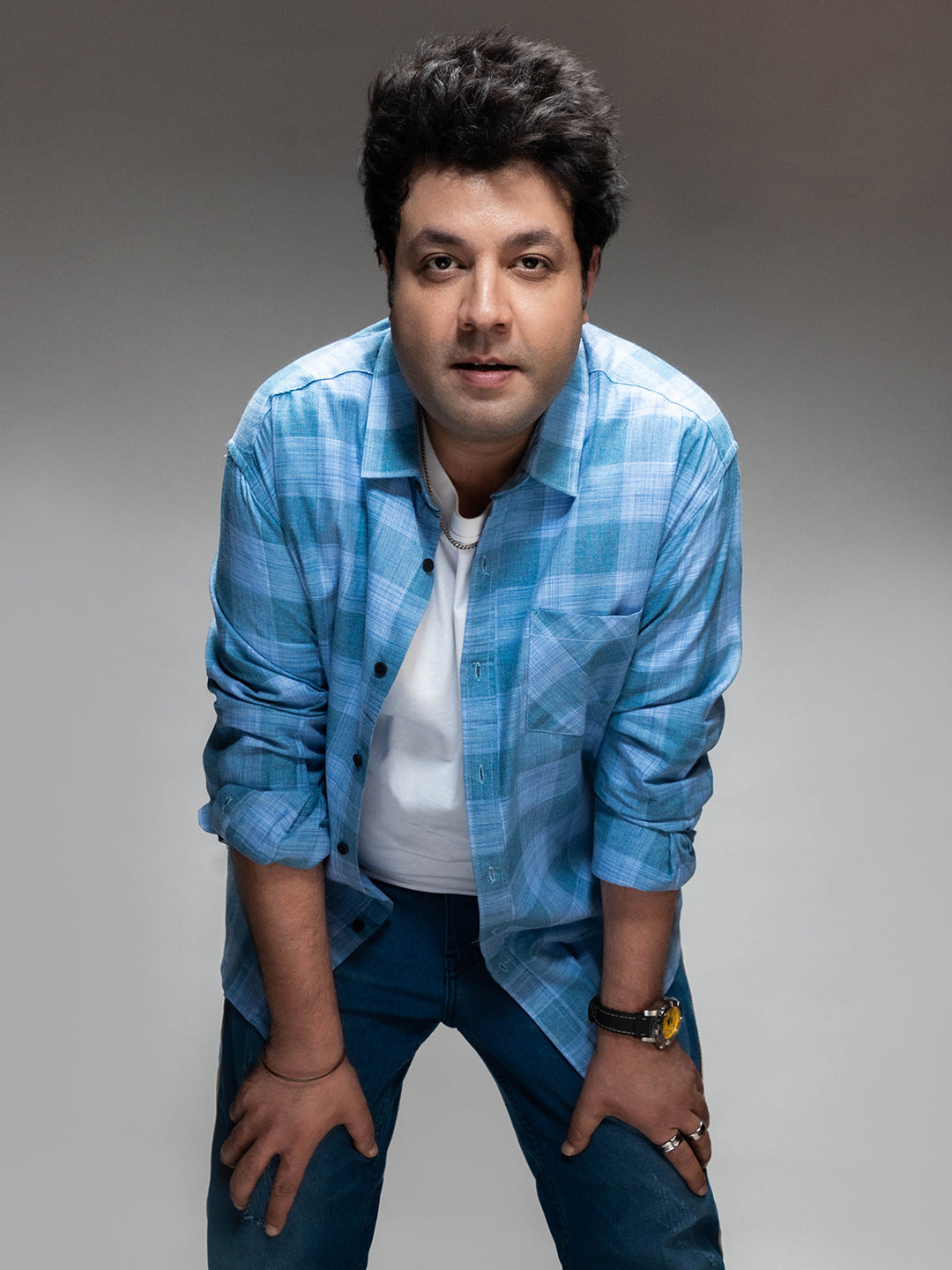 What accessories to wear with a mens plus size cotton blue checks shirt?